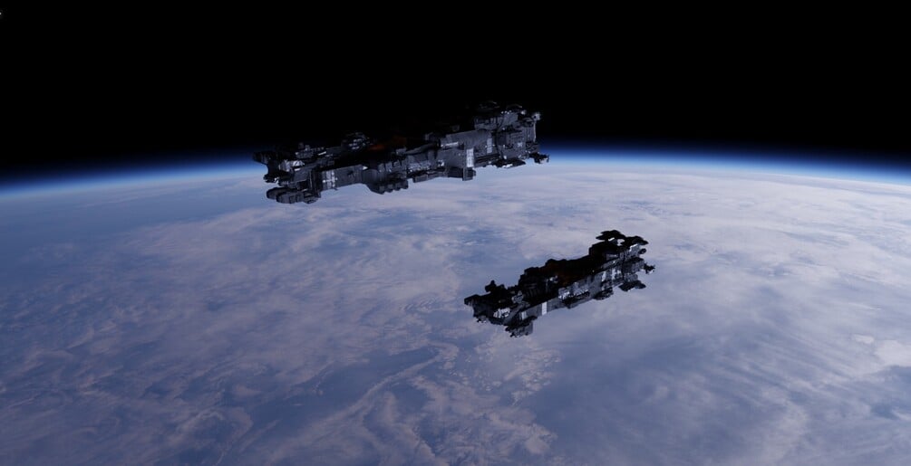 The base models for the spaceship are from a kit called Shipyard which is a collection of CC0 kitbash models.